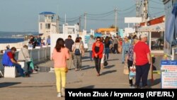 У ларька с сувенирами – туристы. Севастопольцам вещицы «на память» о родном городе совершенно ни к чему. Продавцы интереса к потенциальным покупателям не проявляют, сидят в глубине, уткнувшись в телефоны.