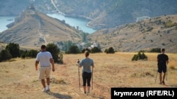 Остатки обоих мощных укреплений уцелели и после Второй мировой, несмотря на то, что после войны сооружения использовались как полигон для испытания авиабомб. Прогуляться к форту Южный – приятное и познавательное путешествие. Путь начинается с горы Крепостной, от развалин Генуэзской крепости Чембало. На фото – здания бывшей метеостанции, а между ними тропа, которая идет по оврагу Шайтан-Дере.