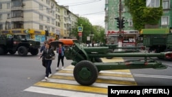 По главной улице города – проспекту Кирова – прошли парадные «коробки» военнослужащих местного гарнизона, полиции, Росгвардии, молодежного движения «Юнармия», кадетских классов местных средних школ, сообщает корреспондент Крым.Реалии.