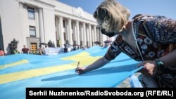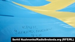 В Киеве активисты развернули под зданием Верховной Рады флаг крымскотатарского народа, на котором все желающие, в частности депутаты и их помощники оставили свои пожелания для жителей Крыма, сообщает корреспондент Крым.Реалии.