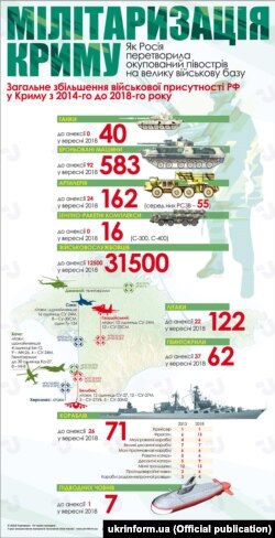 «Численность «зеленых человечков» возросла до почти 32 тысяч, количество самолетов – до 122-х, военных кораблей – до 71-го, зенитно-ракетных комплексов – до 16-ти, количество подводных лодок – до семи. Более того, в Крыму, возможно, уже размещено ядерное оружие. Не только в расконсервированном в 2016 году объекте «Феодосия-13», а и на российских военных кораблях», – сообщает информагентство.