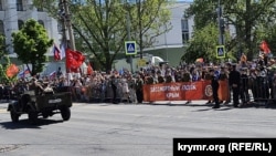 После парада началось шествие «Бессмертного полка» от площади Ленина до Вечного огня в парке имени Гагарина. Корреспондент Крым.Реалии отмечает, что акция вышла более массовой, чем парад. В ней впервые взяли участие отдельные местные жители, дети которых как военнослужащие российской армии погибли во время продолжающихся военных действий в Украине. На акцию они пришли с портретами своих погибших родственников.