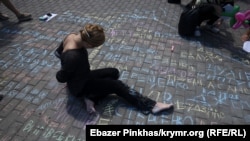Участники акции нарисовали на асфальте карту Крыма, в центре написали «Сенцов», а вокруг него имена других политических заключенных, удерживаемых в России.