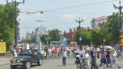 В Благовещенске также прошла массовая акция в поддержку арестованного губернатора Хабаровского края Сергея Фургала. Как сообщает корреспондент Сибирь.Реалии с места событий, около 200 человек сначала вышли на одну из площадей, а после прошли по набережной и направились к центру города. Протестующие скандировали лозунги "Свободу", "Я Мы Фургал", "Москва уходи". За двумя наиболее активными гражданами полиция организовала погоню, задержав одного из них. Однако подошедшим протестующим удалось забрать его. Также по окончанию мероприятия сотрудники МВД стали задерживать самых активных участников.