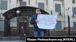 В Киеве 4 апреля под посольством России Петр Дудка, родной брат Владимира Дудки, осужденного в Крыму к 14 годам заключения по «делу украинских диверсантов», провел одиночный пикет, сообщает корреспондент Крым.Реалии.