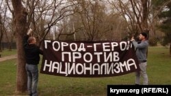 Анархисты растянули черные лозунги на растяжках и прикрепили их к деревьям и столбам. Лозунги гласили «Город-герой (Севастополь) – против национализма», «Свобода, равенство и братство», «Свобода или смерть».