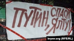 Участники митинга повесили на забор большой плакат с надписями «Путин, спаси Ялту!» и лозунгом «Генплан = дерибан».