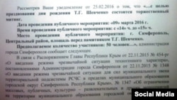 Попова также опубликовала соответствующий документ в Фейсбуке, согласно которому активисты планировали проведение митинга в Симферополе «с целью празднования дня рождения Тараса Шевченко», однако подконтрольные России власти города отказали в проведении мероприятия, сославшись на распоряжение российского главы крымского правительства Сергея Аксенова от 22 ноября 2015 года «О введении режима чрезвычайной ситуации» и «Об ограничении массовых, публичных, культурно-развлекательных и других мероприятий», а также на основании протокола заседания штаба по ликвидации последствий ЧС, которые временно приостанавливают деятельность по проведению массовых мероприятий «вплоть до особого распоряжения».