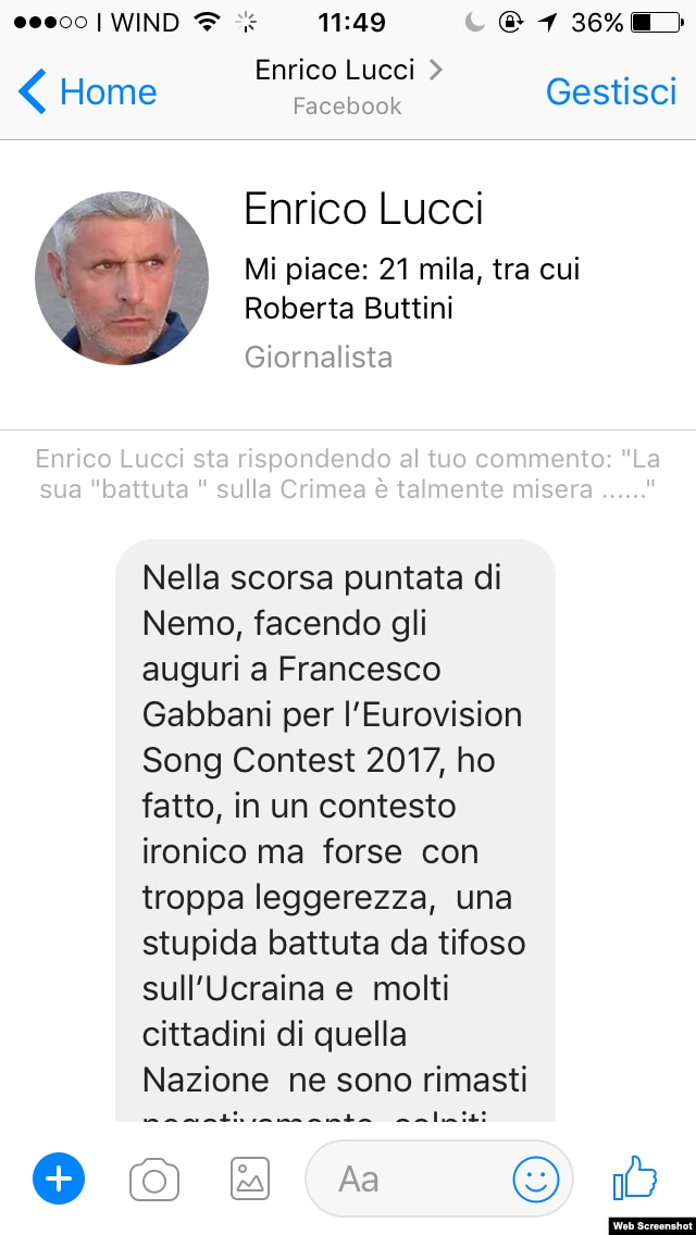 Ведущий итальянского телеканала RAI Энрико Луччи извинился перед украинцами за то, что в эфире своей передачи 5 мая он заявил, что «Украина проиграла Крым и проиграет в конкурсе «Евровидение-2017».