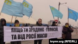 Возле контрольного пункта въезда-выезда «Чонгар» на административной границе с Крымом 18 марта проходит акция против проведения российских выборов на полуострове, сообщает корреспондент Крым.Реалии.