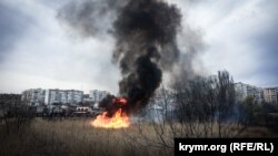 В Симферополе вечером 1 апреля на объездной дороге напротив торгово-развлекательного центра FM между заправкой и жилым микрорайоном загорелось камышовое поле.