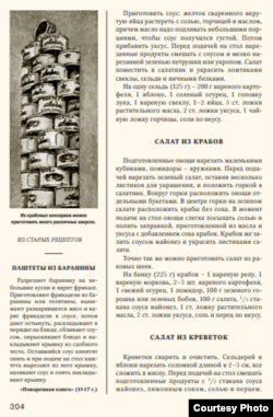 Холодца в книге нет – вместо него студень или заливное. Винегрет есть, но на новогодний стол он не ставился, считался обыденным блюдом. В книге также много салатов из морепродуктов – крабов, кальмаров, креветок. Многие из таких блюд украшались красной икрой.