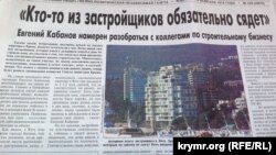 «Крымская правда» в статье «Кто-то из застройщиков обязательно сядет» пишет о деятельности застройщиков на полуострове, которые взяли у дольщиков деньги и даже построили дома, но умолчали о том, что земля под ними предназначена для индивидуального жилого строительства. Многоэтажку, возведенную на таком участке, по закону невозможно ввести в эксплуатацию, подключить к сетям электро-, водо- и газоснабжения. Что делать с такими домами и как помочь людям, теперь будет решать специальная комиссия подконтрольного Москве правительства Крыма. По словам российского вице-премьера Крыма Евгения Кабанова, возглавляющего эту самую комиссию, Совмин в ближайшее время изучит каждый проблемный объект, возведенный на индивидуальном участке, и решит, как помочь дольщикам, уверяет издание. Сам он накануне побывал в Ялте и осмотрел более 40 многоэтажных самостроев. Проблема у всех них одна – отсутствие какой-либо разрешительной документации на объект. «В Ялте этих объектов гораздо больше, чем в других регионах, из-за престижности месторасположения и доступности цены у мошенников – однокомнатную квартиру в Ялте они продавали за 1-1,2 миллиона рублей, что не соответствует ни рынку, ни здравому смыслу. Здесь сейсмоопасная зона, строительство всегда было дороже, но они продавали ниже рынка почти в два раза, поэтому, к сожалению, наши граждане были введены в заблуждение и вкладывали свои деньги», – сказал Кабанов.
