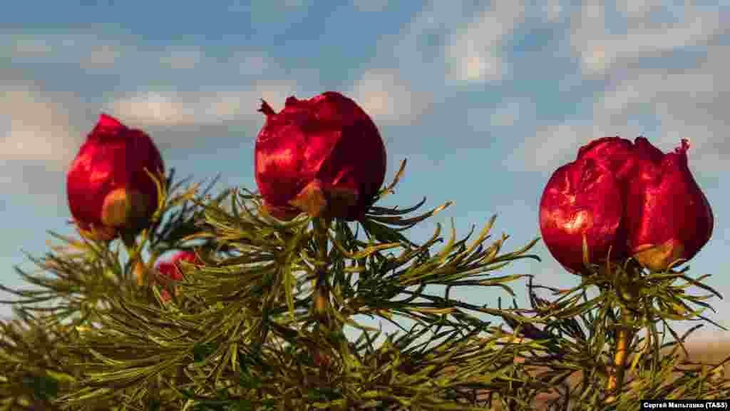 Апрель и май – удачное время для любителей живописных видов, которые хотят лицезреть цветущий Крым во всей красе. Сейчас на склонах холмов на южной окраине Симферополя зацвели дикие горные пионы. Растения занесены в Красную Книгу.