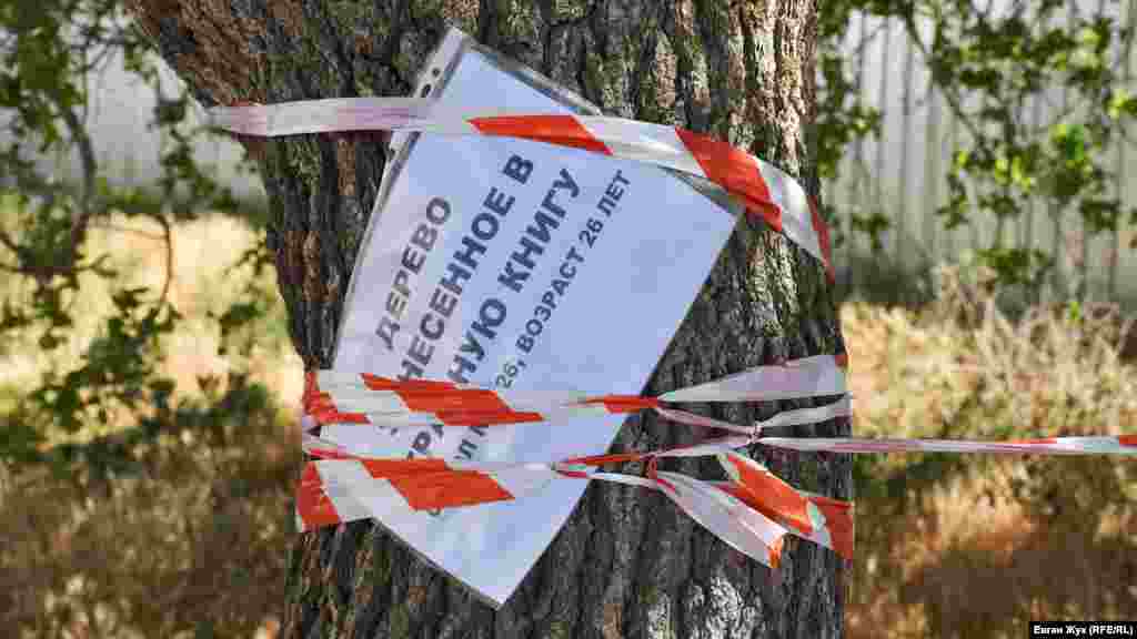 Фисташка, которой 26 лет, находится за территорией стройки. Дерево на всякий случай обмотали лентой и повесели самодельные таблички, информирующие о том, что оно занесено в три Красные книги