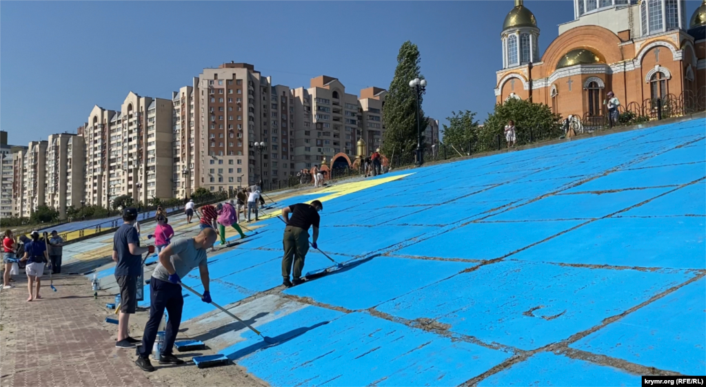 В столице Украины обновили раскраску большого крымскотатарского флага. Впервые национальный символ народа нанесли на бетонные плиты Оболонской набережной Киева еще в 2015 году. Акцию провели перед Международным днем коренных народов мира, который ежегодно проходит 9 августа.