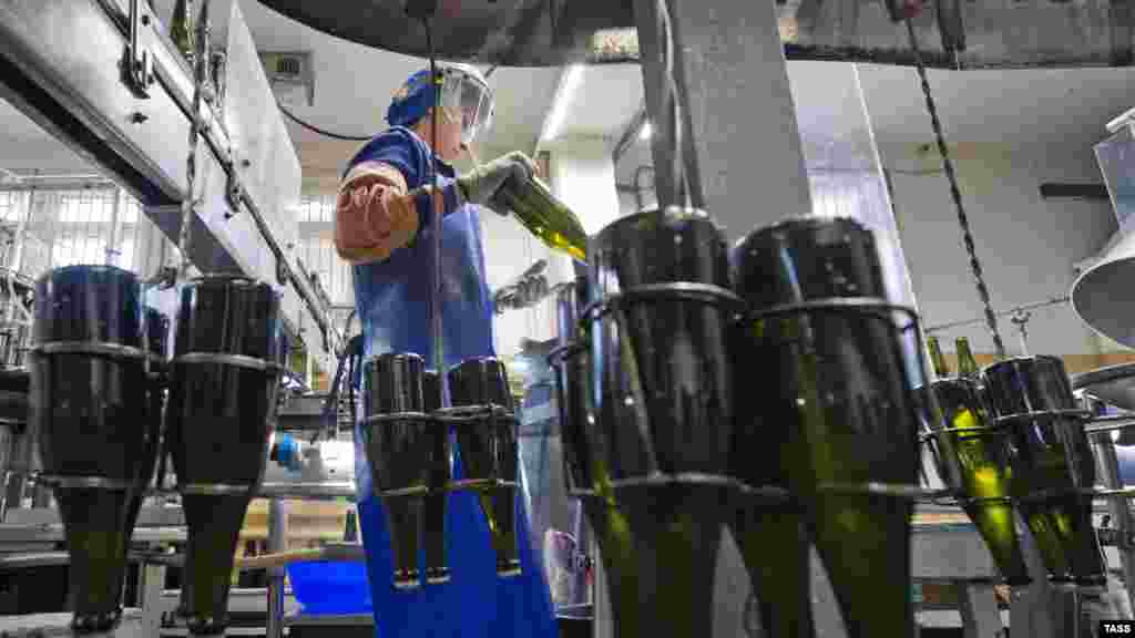 Сотрудница в цехе выполняет операцию дегоржаж (раскупоривание бутылок для выброса дрожжевого осадка, снятие временных пробок и повторное закупоривание) на заводе шампанских вин «Новый свет» в одноименном поселке в аннексированному Крыму.