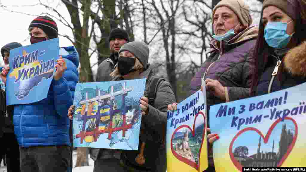 Участники акции держали в руках плакаты с надписью «Крым – это Украина», флаги Украины, крымскотатарский флаг, портреты политузников.
