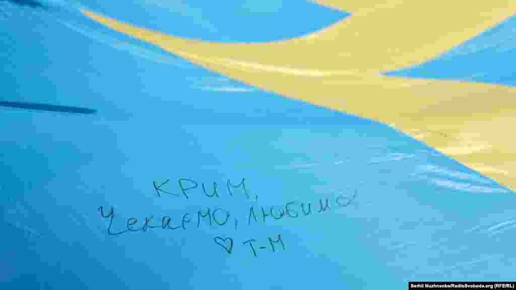 «До встречи дома»: в Киеве оставили пожелания крымчанам на крымскотатарском флаге (фотогалерея)