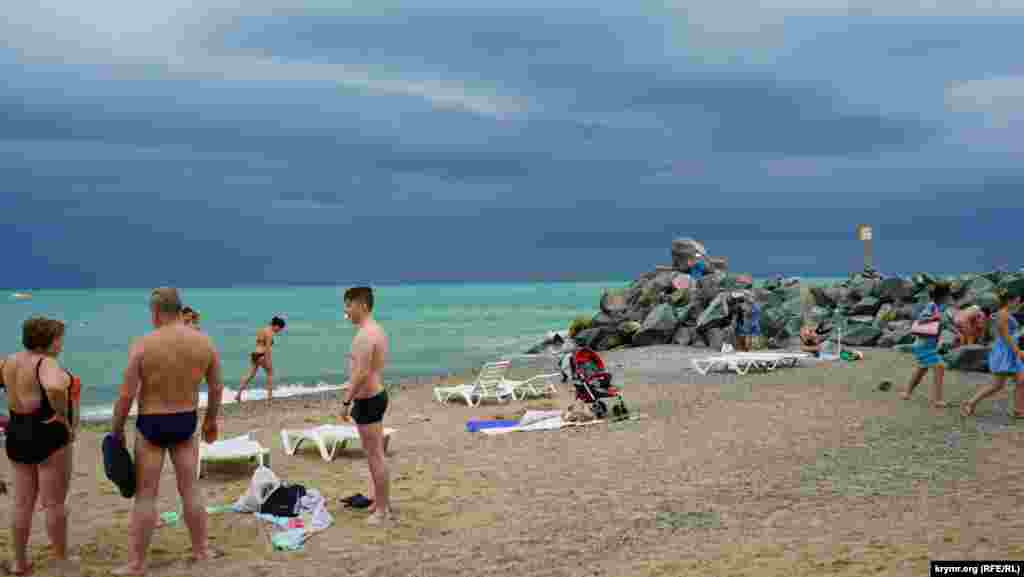 Поселок Николаевка Симферопольского района накрыли ливни. Пока грозовая туча стояла над морем, отдыхающие доедали кукурузу и делали фотографии. А после, укрывшись зонтами и пляжными полотенцами, покинули пляж.