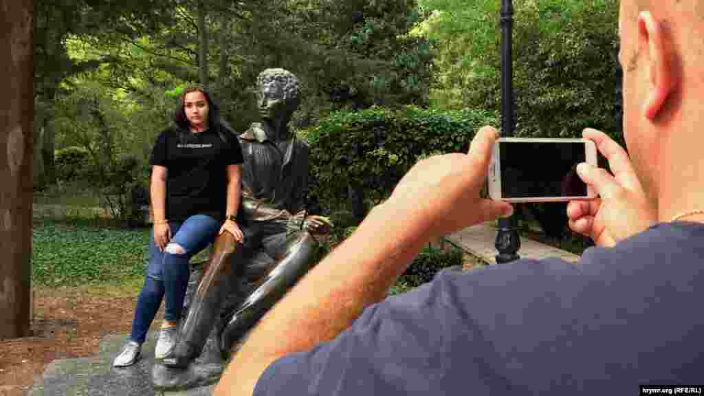 В санатории, расположенном на набережной Гурзуфа, туристы охотно фотографируются с памятниками Ленина и Пушкина