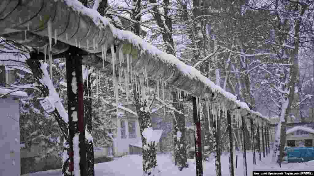 Теплотрасса поселка с возвращением зимы «обросла» ледяными сосульками