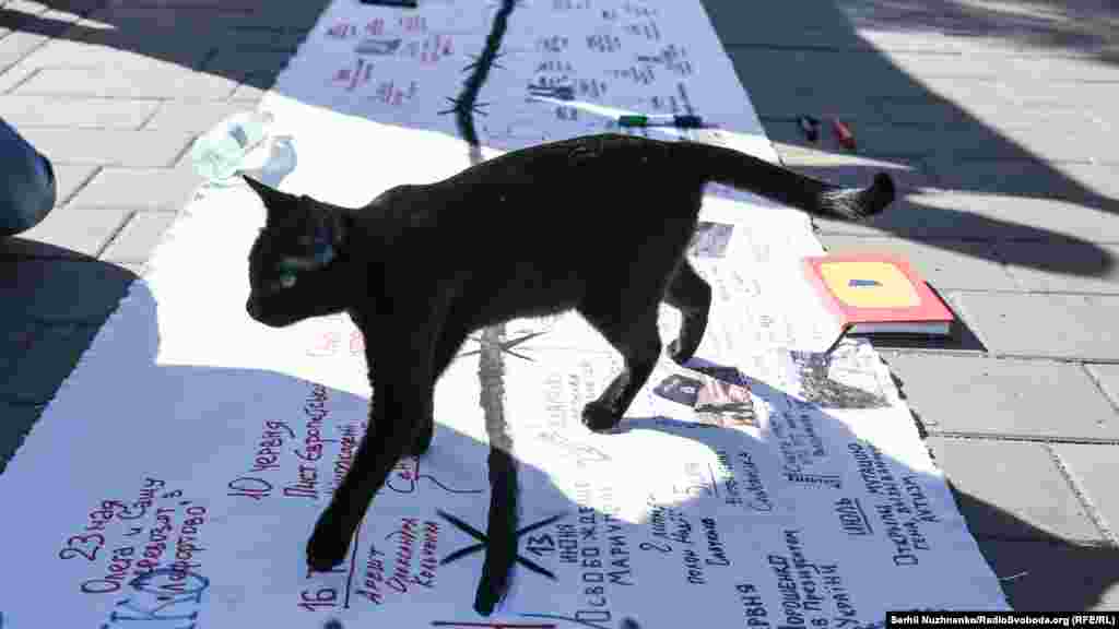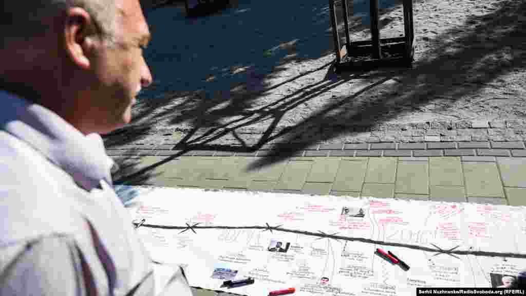 В четвертую годовщину ареста крымчан Олега Сенцова и Александра Кольченко в Киеве состоялась уличная акция. Активисты развернули баннер, на котором черным цветом были отмечены главные мировые события, а красным – события из жизни Сенцова и Кольченко, успевшие произойти за эти четыре года.