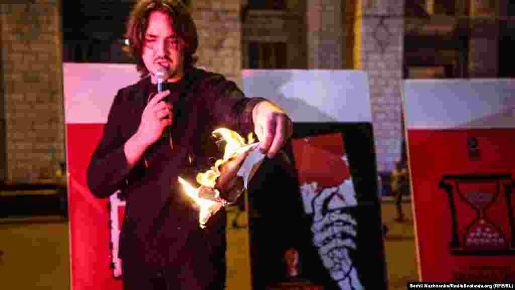 В рамках международной кампании #RedCardForPutin поздно вечером в понедельник 16 июля в Киеве прошла акция-перформанс «БАНДЕРоль для Путина».