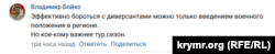 «Эффективно бороться с диверсантами можно только введением военного положения в регионе. Но кое-кому важнее туристический сезон», – подсказывает Владимир Бойко в группе «Черный список Севастополь».