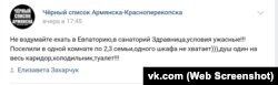 «Лагерь имени Гагарина, Евпатория! Здесь сумку страшно на пол положить, не говоря уже о ребенке, которому 1,9 лет! Питание рассчитано на детей от 7 до 16 лет! Напрашивается вопрос: что здесь делать детям нашего возраста?! Мы уехали от химии, а приехали в номера с тараканами, пылью, грязью, мусором, облеванными стенами, не говоря уже о постельном белье, состоянии мебели и комнаты в целом! Неужели мы заслуживаем такое отношение к себе!» – пишут жители Армянска в соцсети «Вконтакте».