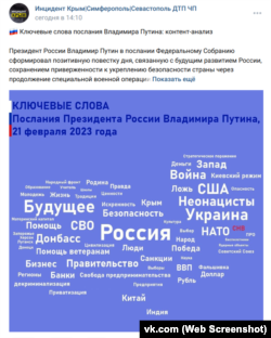 Как всегда, традиционно острое обсуждение развернулось в сообществе «Инцидент Крым|Симферополь|Севастополь ДТП ЧП» социальной сети «Вконтакте», где не только протранслировали само обращение российского президента, но и сделали контент-анализ на основе наиболее часто встречавшихся слов, которые употреблял в речи Путин.