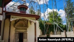«Уже смонтированная конструкция, там будет купол, который позволит разобрать крышу, для того чтобы снять нагрузку и проводить в дальнейшем уже именно реставрационные работы», – рассказывает для СМИ руководитель подконтрольной Кремлю администрации Бахчисарая Александр Трянов.