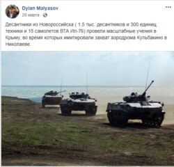 Основатель милитарного ресурса «The Defence Blog» Дилан Малясов, комментируя военные учения на Опуке, заявил на своей странице Фейсбук, что по легенде военных учений российские десантники захватили аэродром на материковой части Украины, в Кульбакино Николаевской области. А главный сценарий для отработок – нападение врагов на Крым.