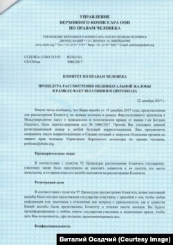 19 декабря 2017 года Виталий Осадчий и его сын Богдан, проживающий в доме отца, подали жалобу в Управление Верховного комиссара ООН по правам человека, находящееся в швейцарской Женеве, в которой изложили суть проблемы.