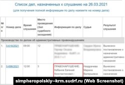 На сайте подконтрольного России Симферопольского районного суда сообщается, что рассмотрение административного дела, в котором фигурирует Евгений Кабанов, состоялось 26 марта – через месяц после инцидента на борту самолета и уже после того, как эта история оказалась в СМИ.