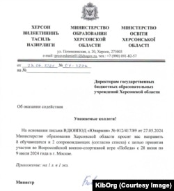 Среди них журналисты увидели обращение так называемого министерка образования оккупационных властей Людмилы Ковтун к директорам школ. Ссылаясь на письмо от «Юнармии», она просит их определить и направить участников и сопровождающих для поездки в Москву на всероссийскую военно-спортивную игру «Победа».