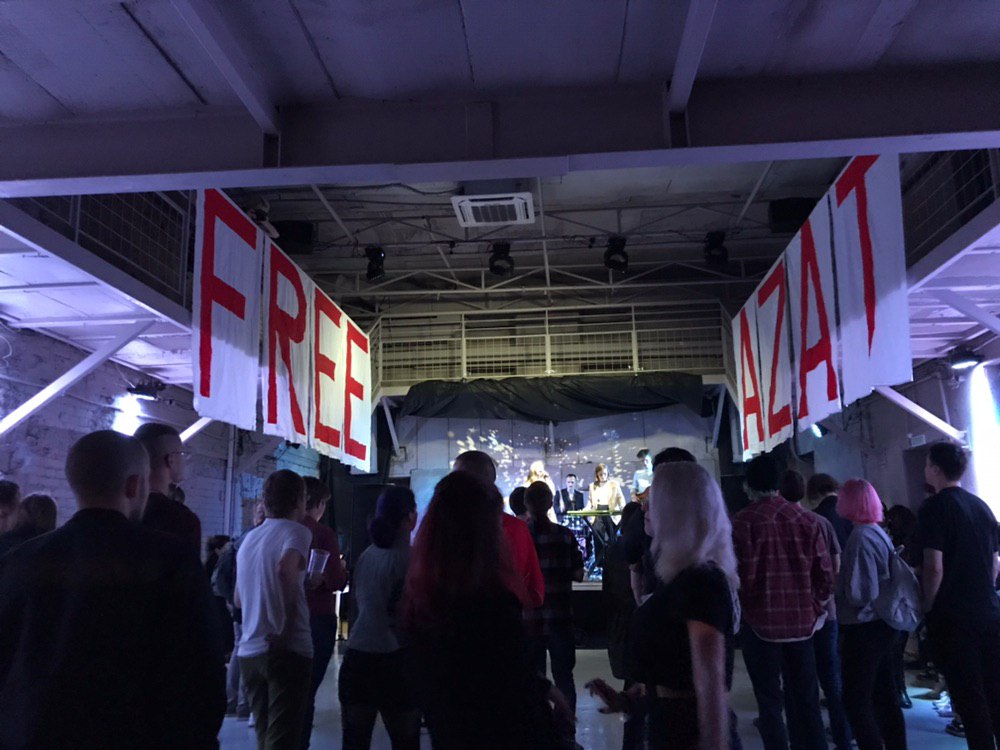 Аспиранта и анархиста Мифтахова обвиняют в попытке поджоге офиса "Единой России" (сначала на него завели дело об изготовлении взрывчатки, но оно развалилось). С февраля 2019-го Мифтахов сидит по этому делу в СИЗО, его защита заявляла о пытках. В день концерта на Бумажной фабрике студенты начали сбор поручительств за Азата, а в начале октября первокурсницы из инициативной группы попытались на Дне открытых дверей спросить о "политзеке МГУ" Мифтахове ректора Садовничего. Их вывела из зала охрана.
