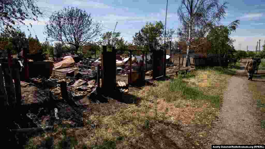 По дороге проходим горящий дом. Боевики используют зажигательные патроны и выжигают село, где стоят украинские военные