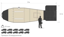 У "Царь-бомбы" было несколько технических наименований: проект 27000, РН202, РДС-202. Она имела размеры 8 метров в длину, диаметр 2 метра и весила примерно 25 тонн. Ни один имеющийся в СССР самолет не мог принять на борт груз такого размера.